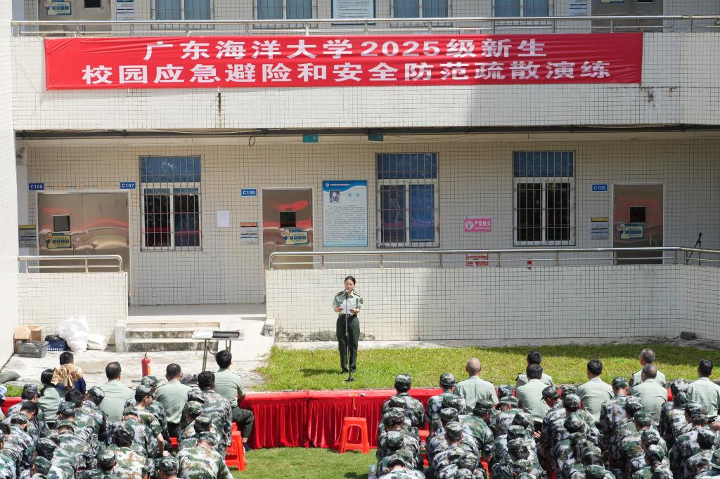 为增强新生消防安全意识,提升应急逃生与自救能力,9月27日上午,学校在湖光校区望海楼(第三实验楼C座)组织2025级新生开展消防疏散演练暨消防器材使用培训。学校党委副书记、军训旅政治委员谭平参加活动并作总结讲话。党委宣传统战部、学生工作部、保卫部(武装部)、后勤保障部等部门负责人,湛江市消防救援支队友谊特勤站消防指战员,军训营营长、教导员、指导员及2025级参训新生代表约1300人参加活动。本次活动采取线上线下相结合方式开展,未到场学生通过企业微信同步观看。